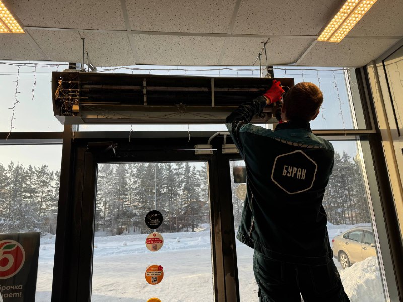 На днях сервисная бригада компании «Буран» в составе специалистов Алексея и Владимира выполнила ремонт тепловой завесы ИЗТТ в одном из магазинов «Пятёрочка» в городе Томск. Оборудование вышло из строя и перестало выполнять свою основную функцию — защиту входной группы от холодного воздуха, что особенно критично в период перепадов температур.