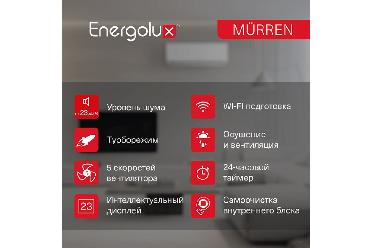 Сплит-система On/Off Energolux Murren SAS18MR1-A / SAU18MR1-A – это идеальный выбор для тех, кто ценит комфорт, надежность и современные технологии. Создайте уютную атмосферу в вашем доме или офисе с помощью этого высококачественного кондиционера!