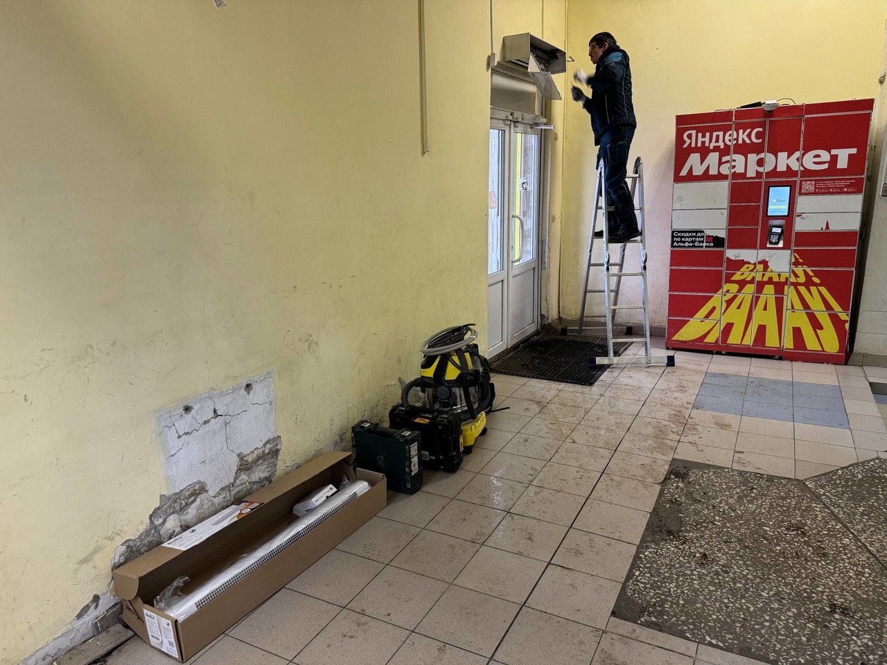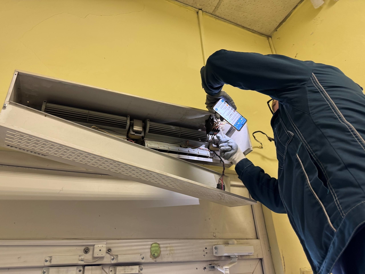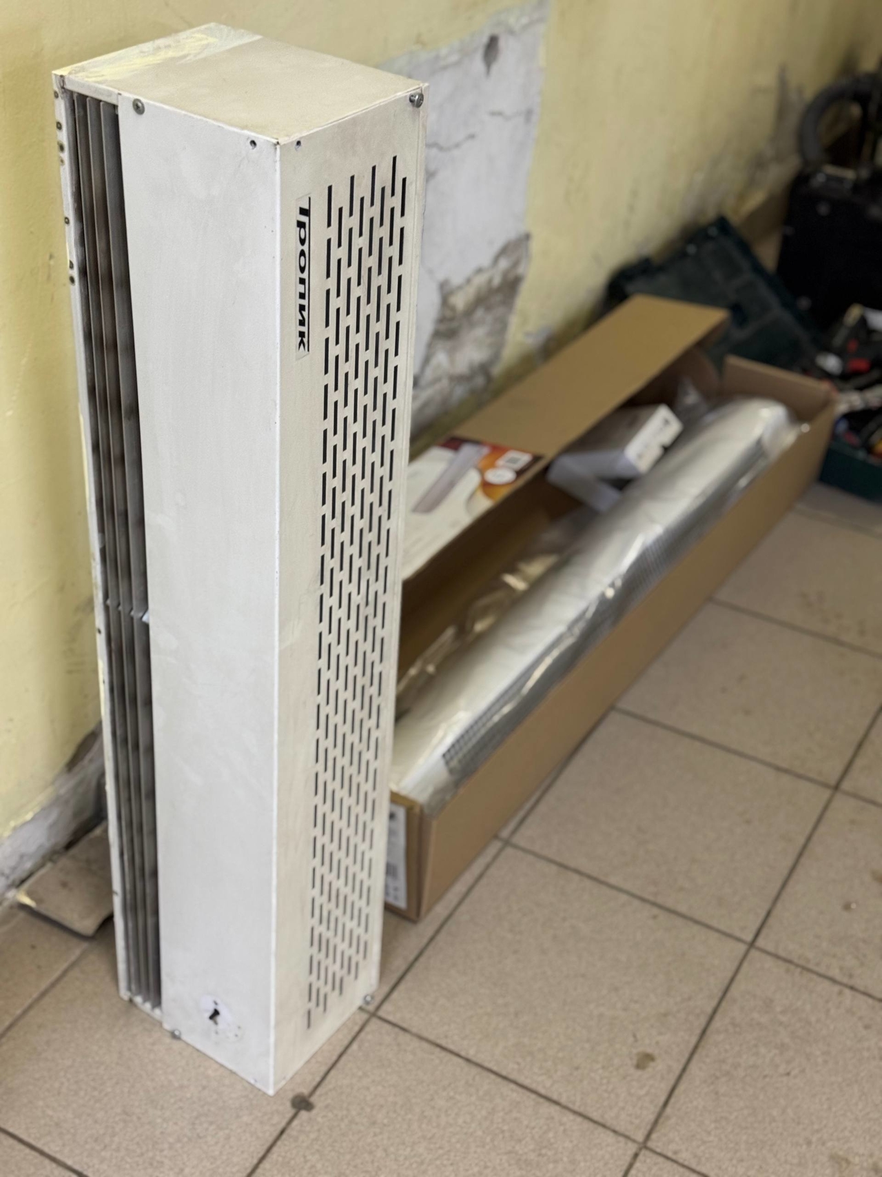 Сначала была выполнена демонтаж старой тепловой завесы. Это включало в себя отключение старого устройства от электросети и аккуратный демонтаж его креплений. -