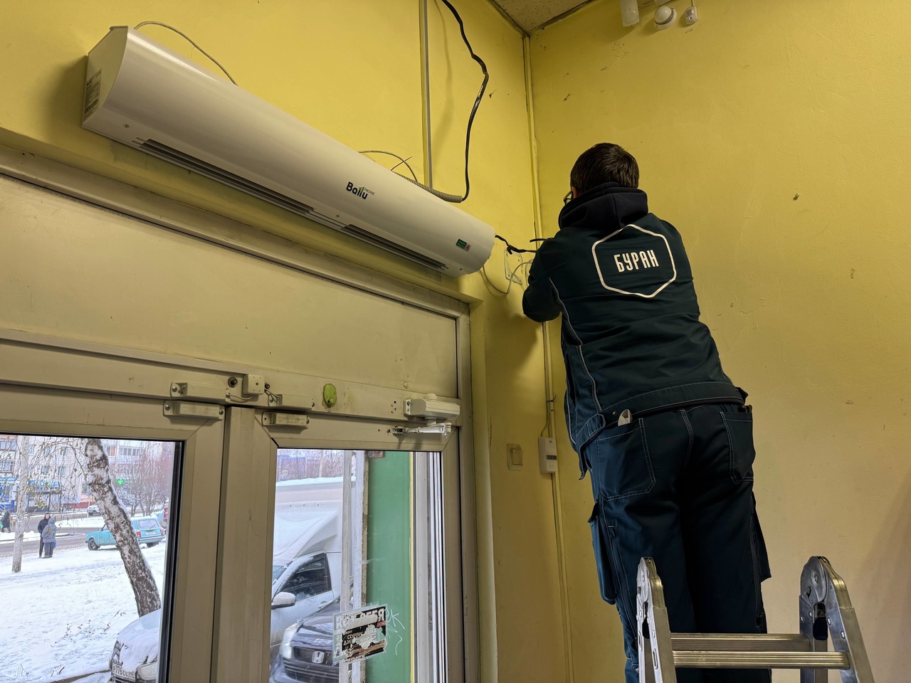 Далее была проведена установка новой тепловой завесы Ballu BHC-L10-S06. Специалисты убедились, что устройство правильно закреплено и подключено, а также что оно работает без сбоев. -